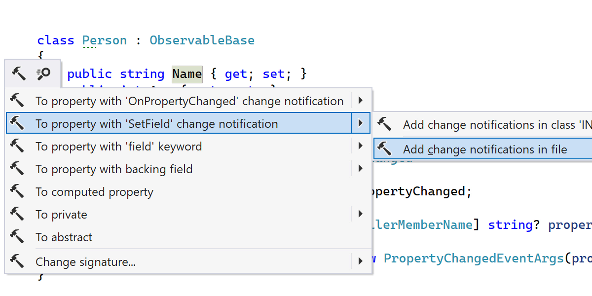 INotifyPropertyChanged 支持的更新 在此版本中,我们重做了 INotifyPropertyChanged 支持。 它不再依赖于外部注解来检测常见 INotifyPropertyChanged API,我们由此能够自动支持更多的 MVVM 框架和 INotifyPropertyChanged 基类。 我们现在可以发出 SetField 方法,该方法能够为 INotifyPropertyChanged 通知实现最简洁的语法。