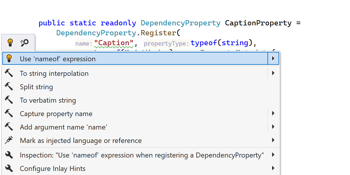 ReSharper 2022.2 现在可以识别 WPF 项目中 DependencyProperty 的注册,并建议使用 nameof 运算符来捕获相应的 CLR 属性名称。 更新的内置实时模板将发出 nameof 而不是字符串字面量。