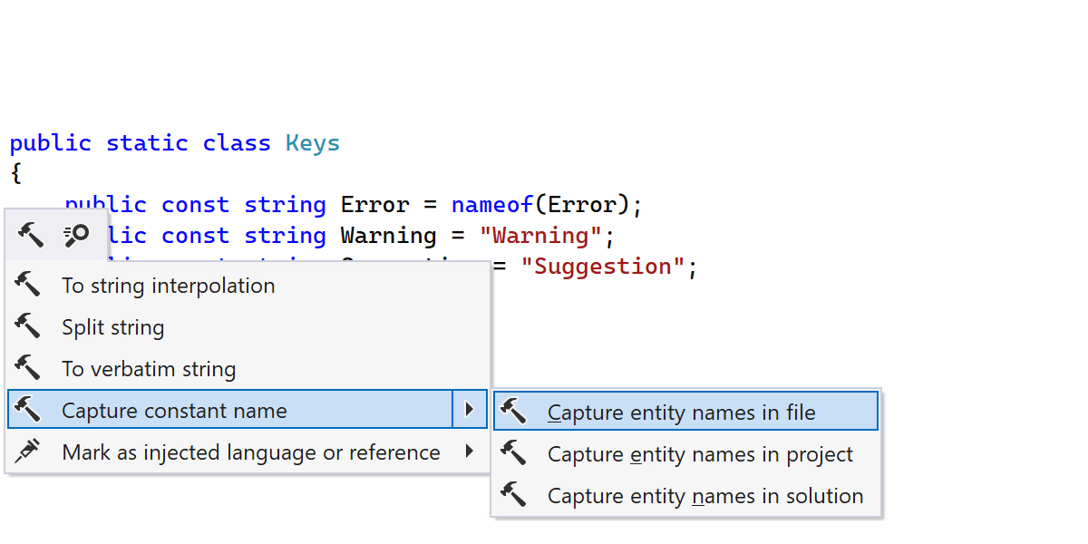 ReSharper 通常无法识别代码中指定某些代码实体名称(如成员或类型名称)的特定字符串字面量的特殊含义。 对此,我们为字符串字面量引入了新的 Capture element name(捕获元素名称)上下文操作,其标识符可以引用包含字符串字面量的上下文中的代码实体。