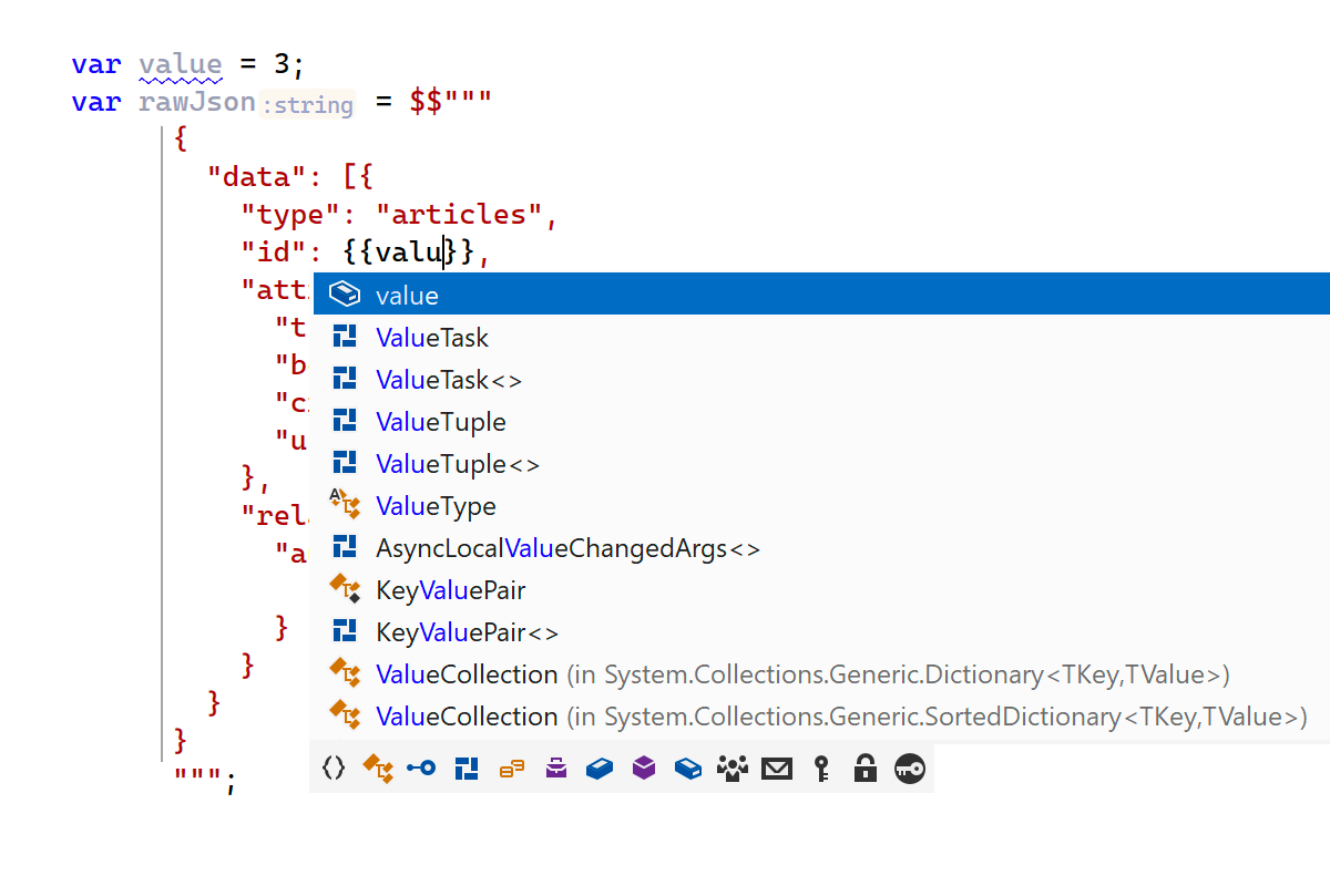 ReSharper 具有基本的原始字符串支持,包括编译器错误和正确解析以及 """ 语法的颜色高亮显示、双引号对和内插字符串内的占位符({{...}} 语法)。