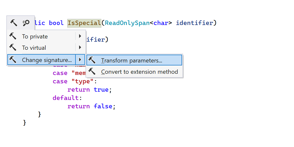 Change Signature(更改签名)、Transform Parameters(变换形参)、Convert to extension method(转换为扩展方法)和 Convert Property To Method(将属性转换为方法)重构现在都可用作成员签名的上下文操作。
