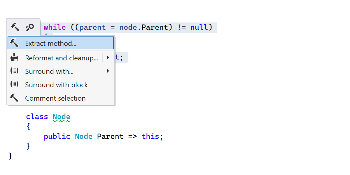 我们添加了在所选代码段上调用 Alt+Enter 菜单时的 Extract method(提取方法)上下文操作。
