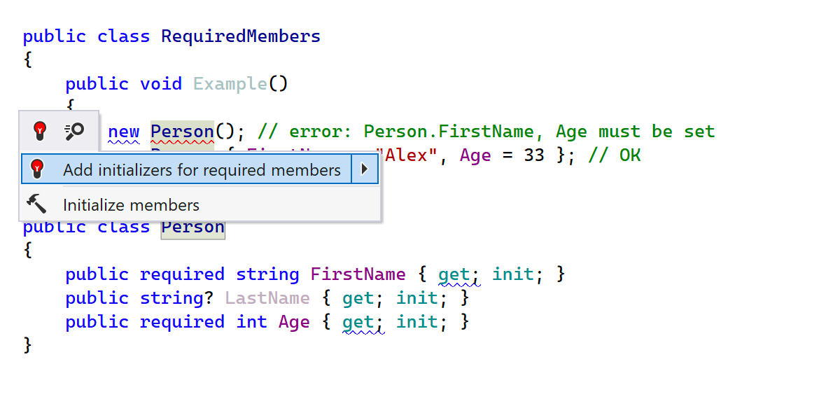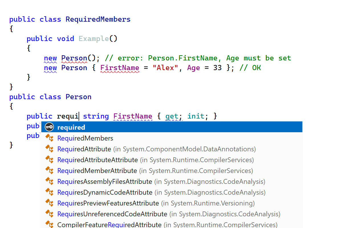 除了能够检测 class、struct 或 record 类型中成员的 required 关键字之外,ReSharper 还为 required 关键字提供了额外支持: