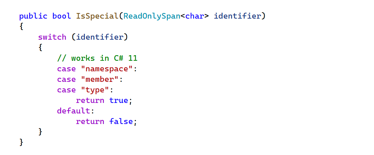 >>>),包括对用户定义运算符 >>> 重载的支持。 Span<char> 值的使用以替代字符串实例,因为在 C# 11 中,字符串常量可以直接与 Span<char> 和 ReadOnlySpan<char> 类型的值进行模式匹配。