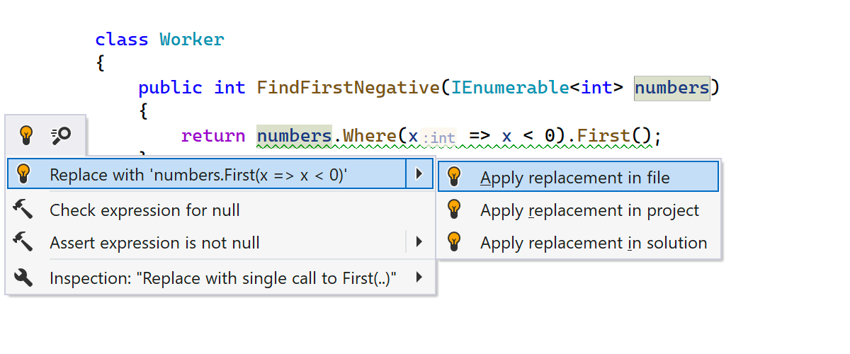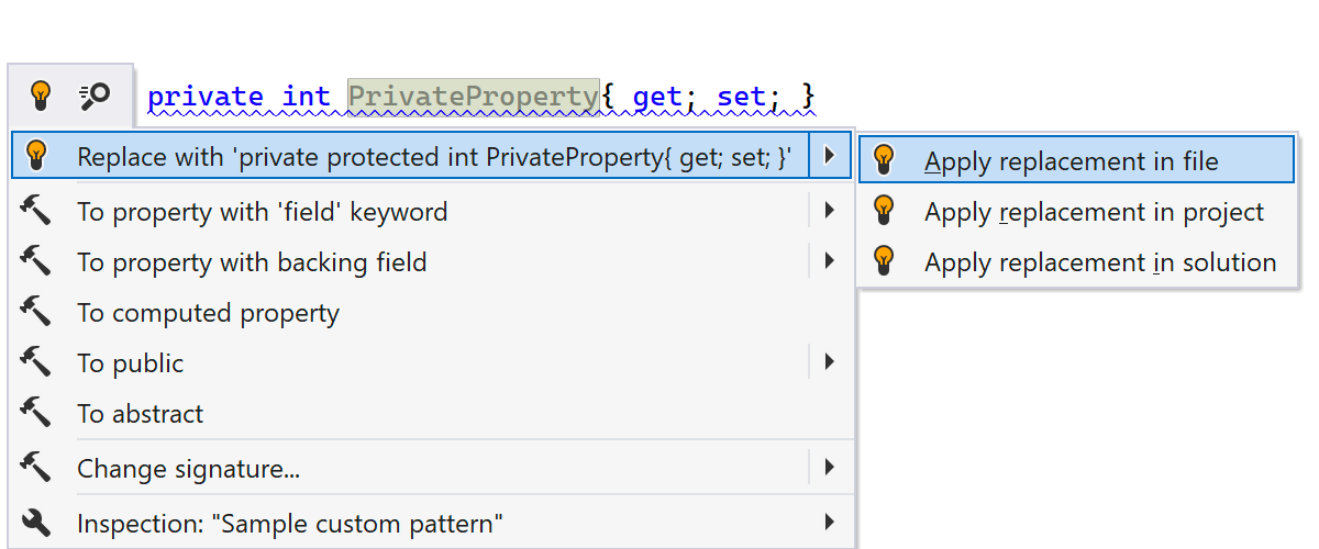 来自结构化搜索和替换 (SSR) 模式的快速修复现在可应用于文件、文件夹、项目或整个解决方案范围。 这会影响 ReSharper | Options | Code Inspection | Custom Patterns(ReSharper | 选项 | 代码检查 | 自定义模式)页面上创建的用户自定义模式、ReSharper 内置代码检查以及基于 SSR 的相应修正。