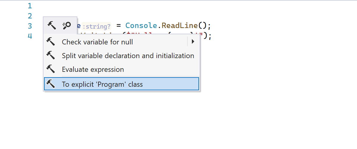 .NET 6 引入了使用 C# 9 顶级语句的新项目模板。 顶级语句简化了 Program 类或 public static void Main(string[] args) 方法的声明。 但有时,显式启动 class Program 是必要做法或更优解。 ReSharper 2022.2 添加了新的上下文操作 To explicit 'Program' class(到显式 'Program' 类),用于执行对旧样式的转换。