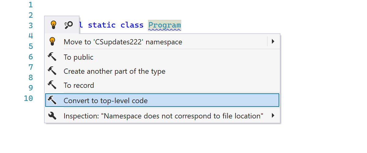 同时,如果您拥有现有 Program 启动类并希望迁移到顶级语句,可以使用新的 Convert to top-level code(转换为顶级代码)上下文操作。