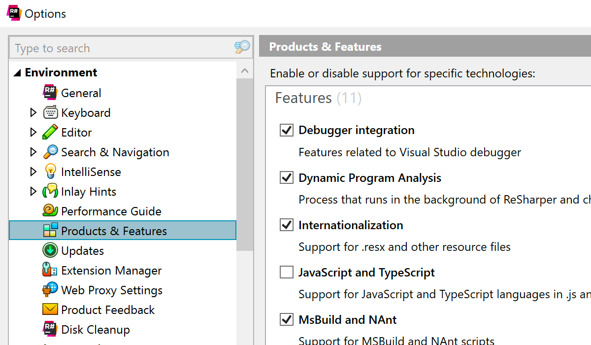 许多人可能已经发现 ReSharper 中的 JavaScript 和 TypeScript 支持已经过时且速度缓慢。 在当前实现中,很难紧跟 TS 语言变化并快速支持新版本,因此我们正在寻找一种更好的方式来支持这些语言。 经过长时间的内部讨论,我们决定暂停当前的 JS 和 TS 支持。 因此,我们在此版本中默认禁用了 TS/JS 支持。 如果您仍想使用,可以在此处重新启用:ReSharper | Options | Environment | Products & Features | the "JavaScript and TypeScript" checkbox(ReSharper | 选项 | 环境 | 产品和功能 | “JavaScript 和 TypeScript”复选框)。