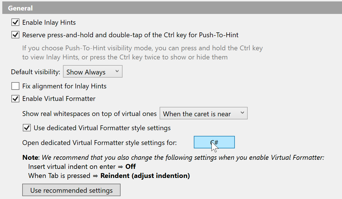 新引入的 Virtual Formatter 让您无需重新格式化磁盘上的源代码即可在所需格式下查看代码。 例如,您现在可以虚拟对齐列中的形参或增加缩进。 此功能的目标是提高代码的可读性和可维护性,让它对视障和神经多样性开发者更易访问。 要启用具有预定义设置的 Virtual Formatter,请转到 ReSharper | Options | Environment | Inlay Hints | General(ReSharper | 选项 | 环境 | 嵌入提示 | 常规)。 要进一步根据特定规范定制格式,请选中 Use dedicated Virtual Formatter style settings(使用专用 Virtual Formatter 样式设置)复选框并点击 C#。