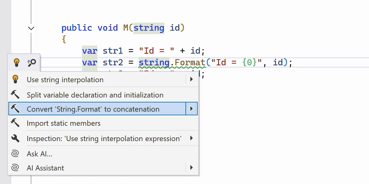 您可以借助一项新上下文操作将字符串内插转换回串联。 ReSharper 长期支持将字符串串联 "Id = " + someId 转换为内插 $"Id = {someId}" 或 string.Format("Id = {0}", someId),但此更新通过允许反向转换完成了整个循环,让您在构建字符串表达式时拥有更大的灵活性。