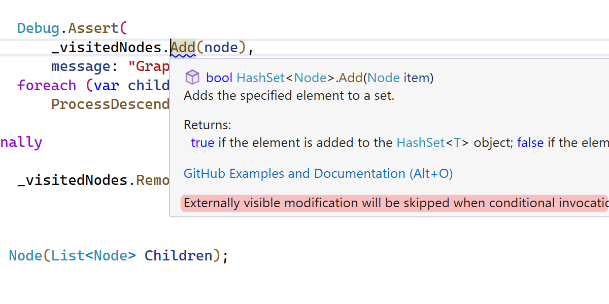 Debug.Assert 检查中的修改警告 由于 Debug.Assert 调用在 RELEASE 构建中被移除,ReSharper 会对修改状态并可能导致生产代码中出现意外行为的断言发出警告。