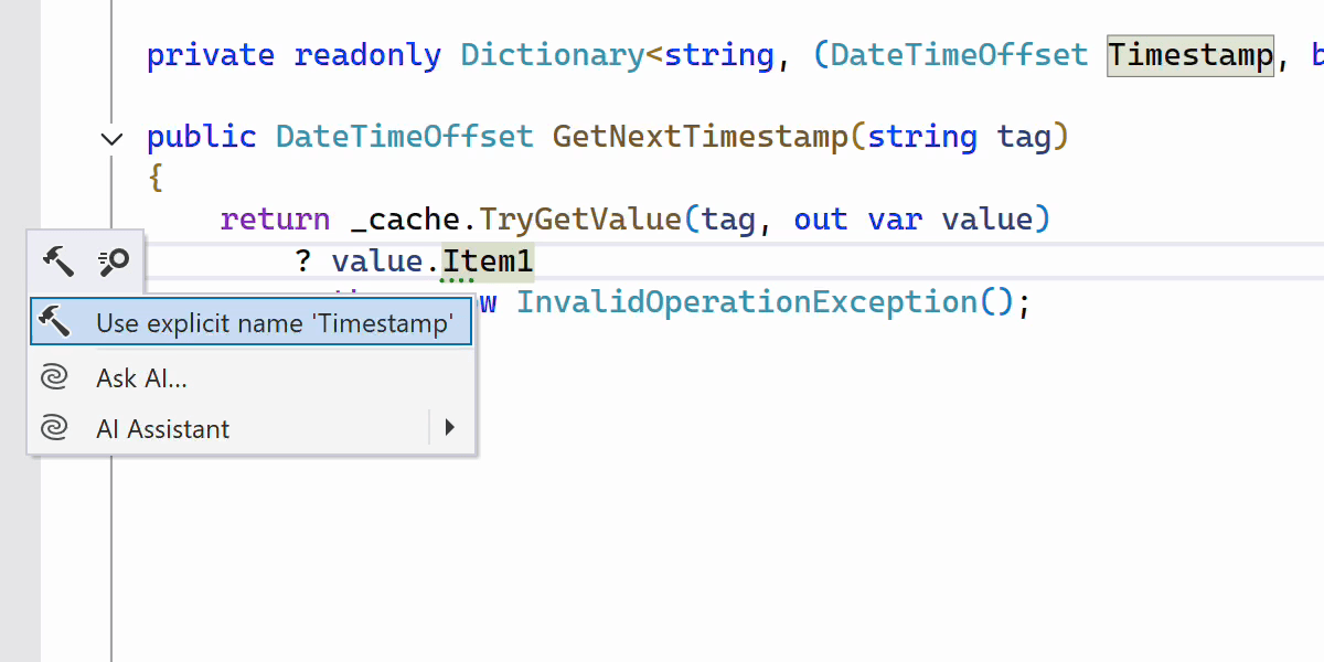ReSharper 2025.1 建议使用显式元组组件名称而不是泛型 ItemN 名称,使您的代码更易阅读和自归档。