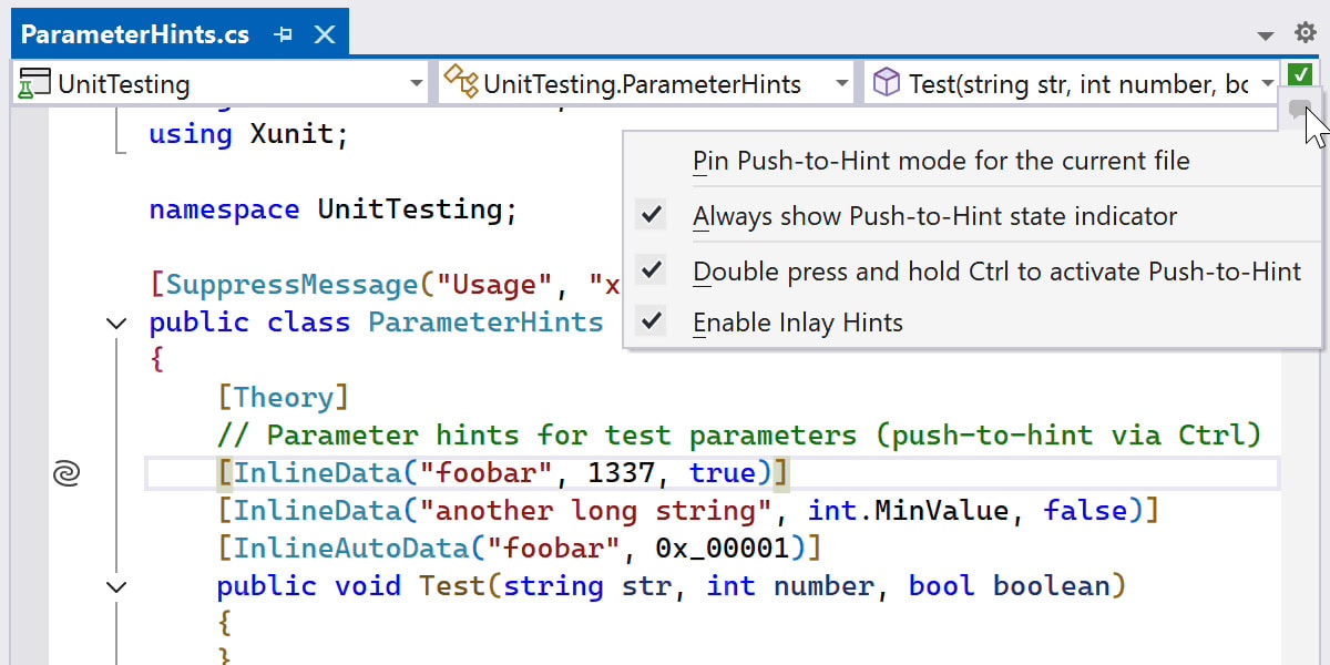 我们改进了 ReSharper 中的一键提示行为,防止因与其他基于 Ctrl 的快捷键冲突而导致的意外激活。 此外,我们还引入了视觉指示器来显示该模式何时处于有效状态。