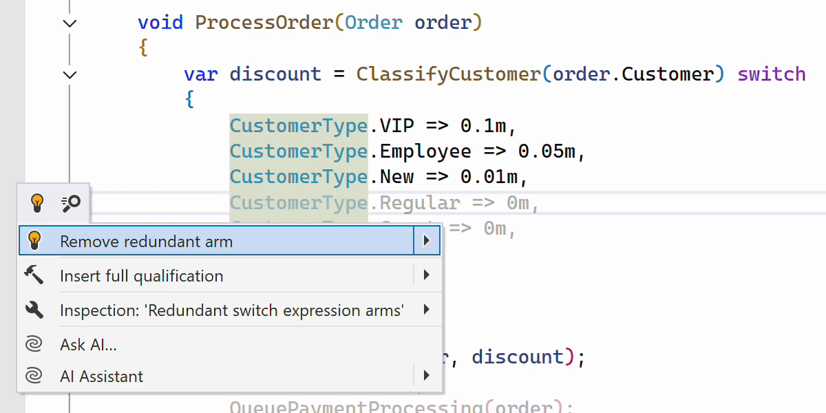 ReSharper 现在可以检测并高亮显示 if 和 switch 等条件构造中出现的更多代码重复模式,并为更清洁、更易维护的代码提出重构建议。