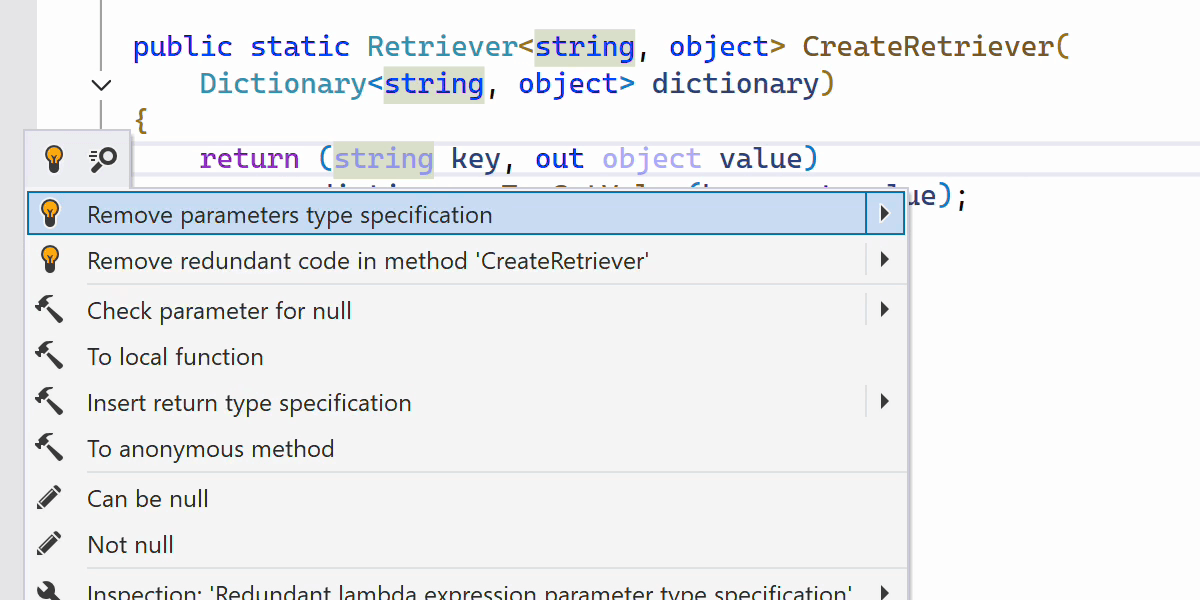 在 C# 14 中,您现在可以在 lambda 表达式中使用 ref、out、in 和 scoped 等形参修饰符,而无需显式形参类型。 ReSharper 提供了快速修复来移除冗余的类型规范。