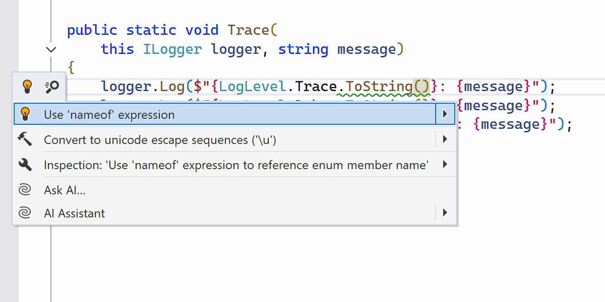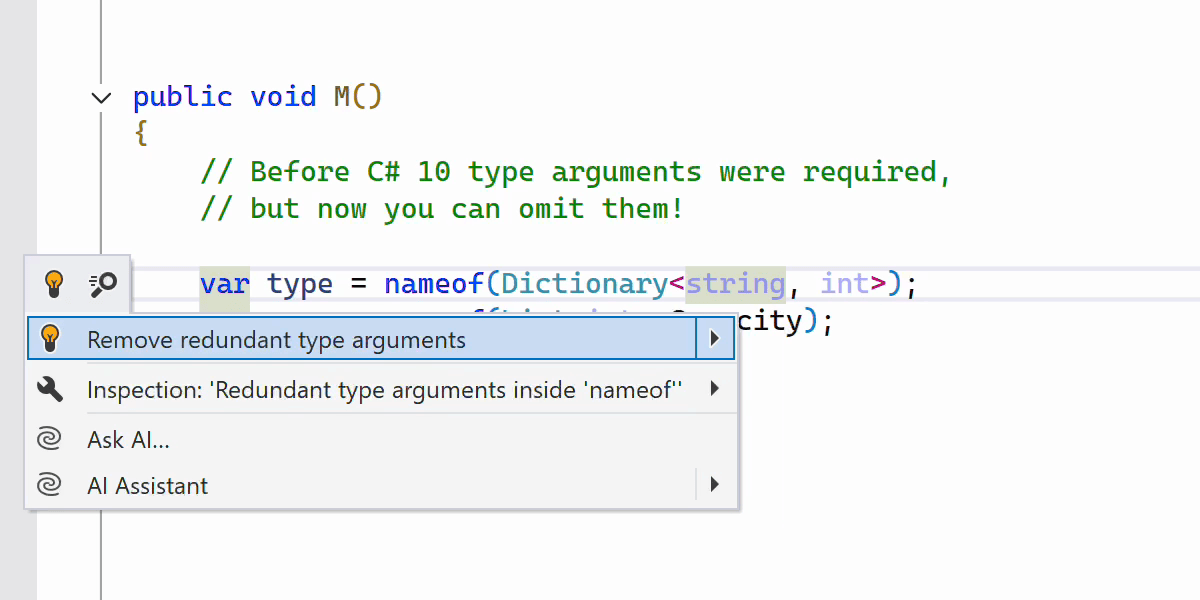 nameof 以前,使用 nameof 需要指定所有类型实参,导致不必要的冗长。 C# 14 允许 nameof(List<>) 而不显式列出类型实参。 ReSharper 现在可以检测 nameof 表达式中的冗余泛型类型实参,并提供了快速修复来简化它们。