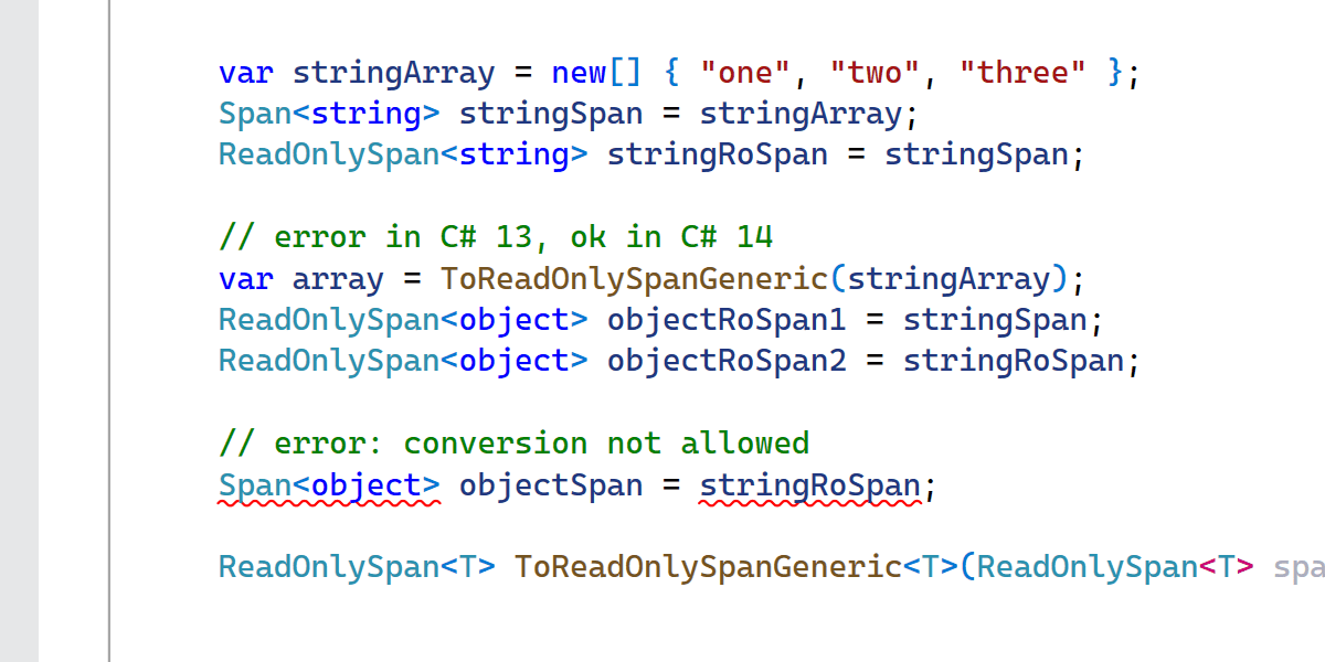 Span<T> 转换 C# 14 在 ReadOnlySpan<T>、Span<T> 和 T[] 之间引入了新隐式转换,使基于 span 的代码更加直观。 ReSharper 现在完全支持这些转换规则,帮助您编写高效、现代的 C# 代码。