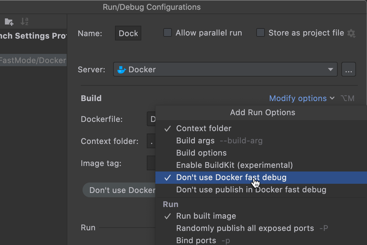 您可以通过 Edit Run Configuration | Build | Modify options | Don’t use Docker fast debug(编辑运行配置 | 构建 | 修改选项 | 不使用 Docker 快速调试)禁用特定运行配置的 Fast 模式。