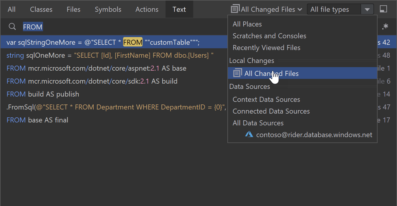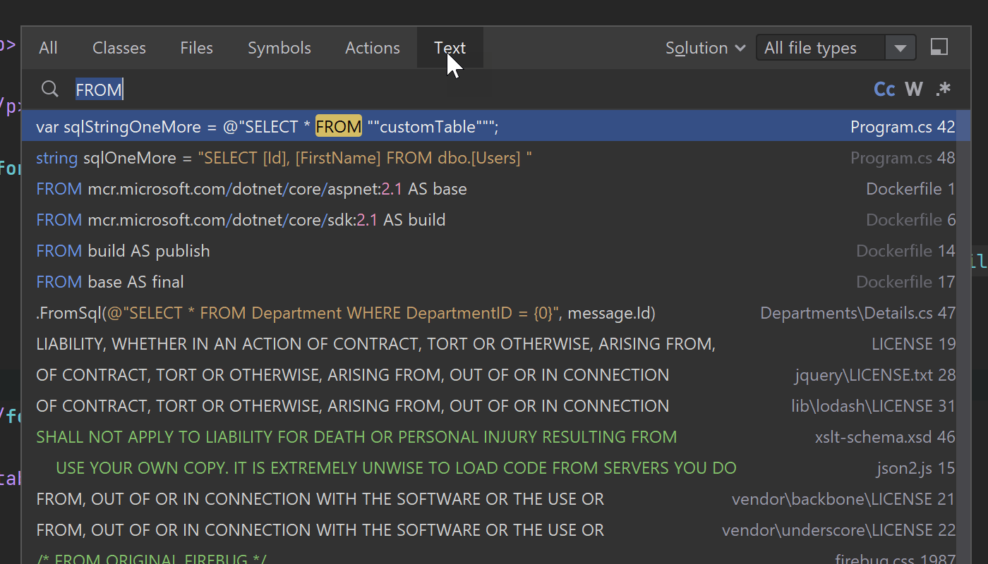Search Everywhere(随处搜索)是您在解决方案、IDE 设置或 Git 历史记录中查找内容时的主要入口点。 我们在 Rider 2022.1 中添加了新的 Text(文本)标签页,可以在您输入时显示解决方案中与字符串匹配的所有文本。 它可以在所有代码和文本文件中运行全文本搜索,包括 .cs、.fs、.cshtml、.json、.js、.css、.editorconfig、.cvs、.dockerfile、.md 和 .txt 文件。