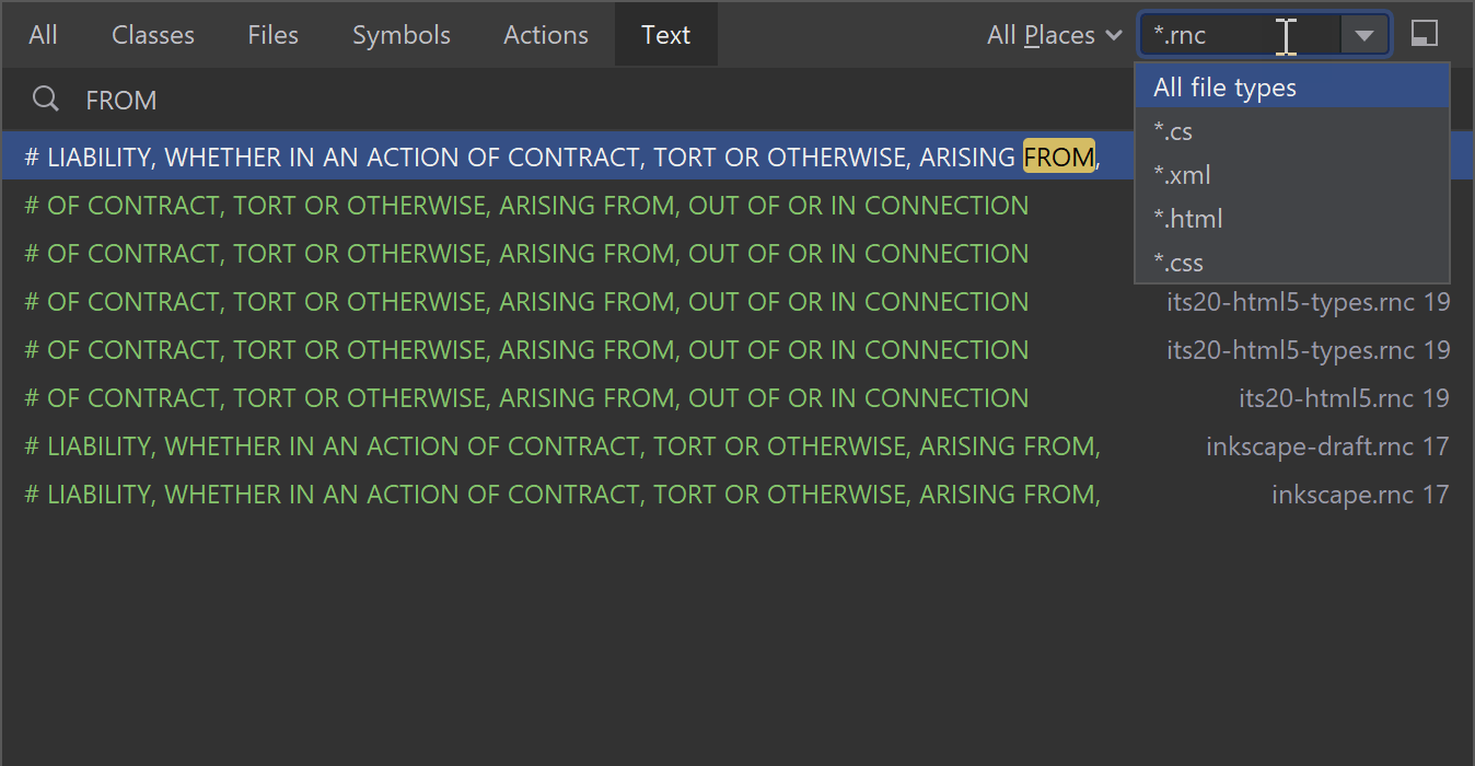 Search Everywhere(随处搜索)中的此文本搜索不会影响现有的 Find in Files(在文件中查找)功能。 您可以同时使用这两种功能。