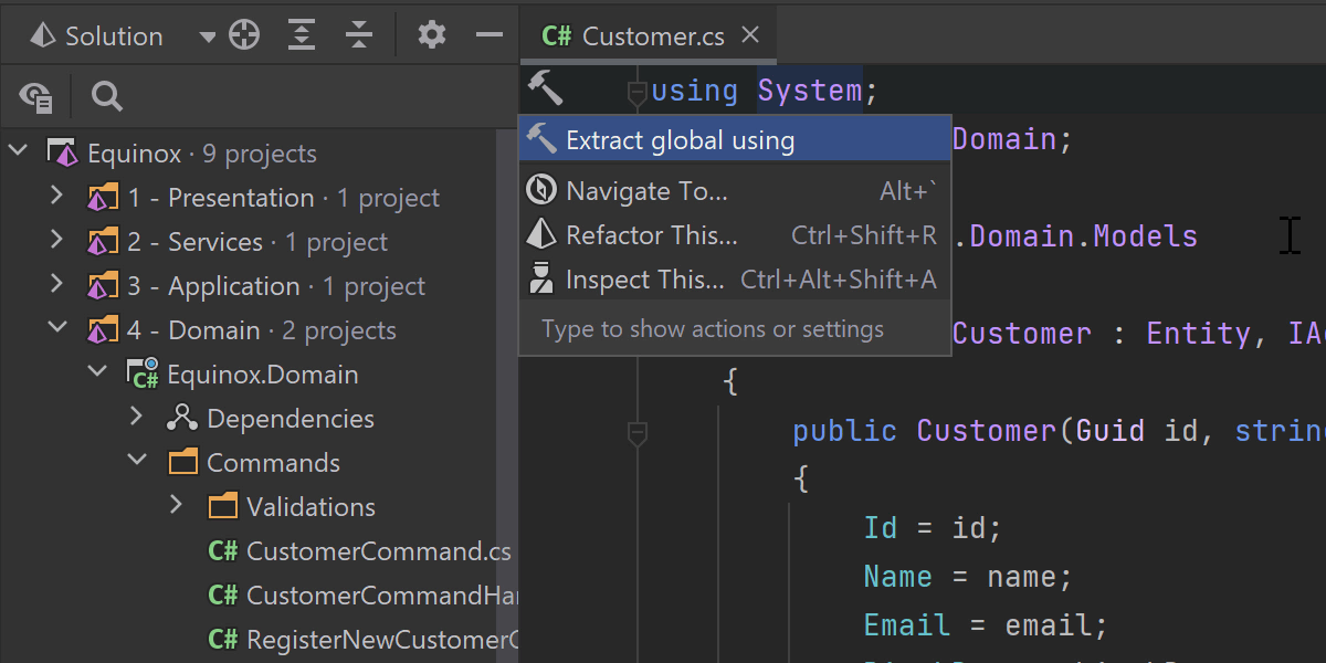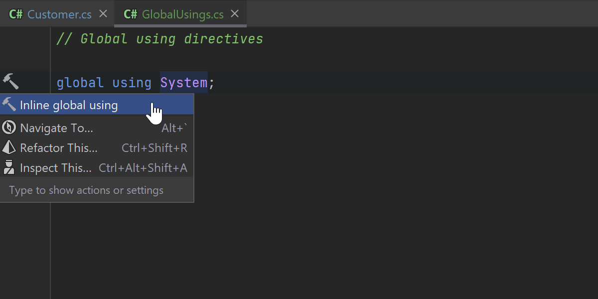 我们继续改进对 C# 10 的支持,特别是 Global Using。 我们已经实现了两个新重构,它们也可用作上下文操作。