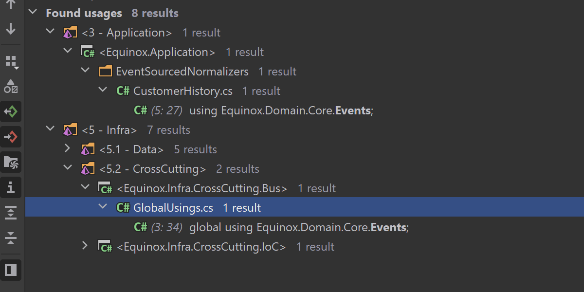 如果您决定将 global using 重构为常规 using,Inline Global Using(内联 Global Using)重构也可以提供帮助。 在 global using 上调用时,它会将其从 GlobalUsings.cs 中移除,并将相应的 using 语句添加到项目中需要的文件中。