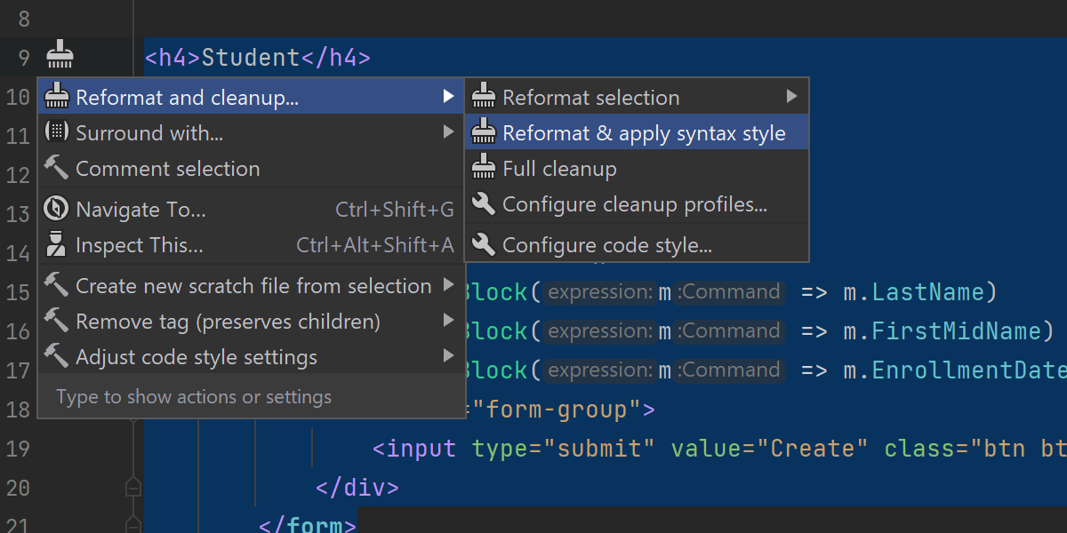 我们重新组织了 Alt+Enter 菜单中与代码清理和格式设置相关的所有条目。 Format selection(设置选区格式)、Cleanup selection(清理选区)和 Apply syntax style(应用语法样式)合并为一个 Reformat and Cleanup(重新格式化和清理)条目,提供单个入口点。
