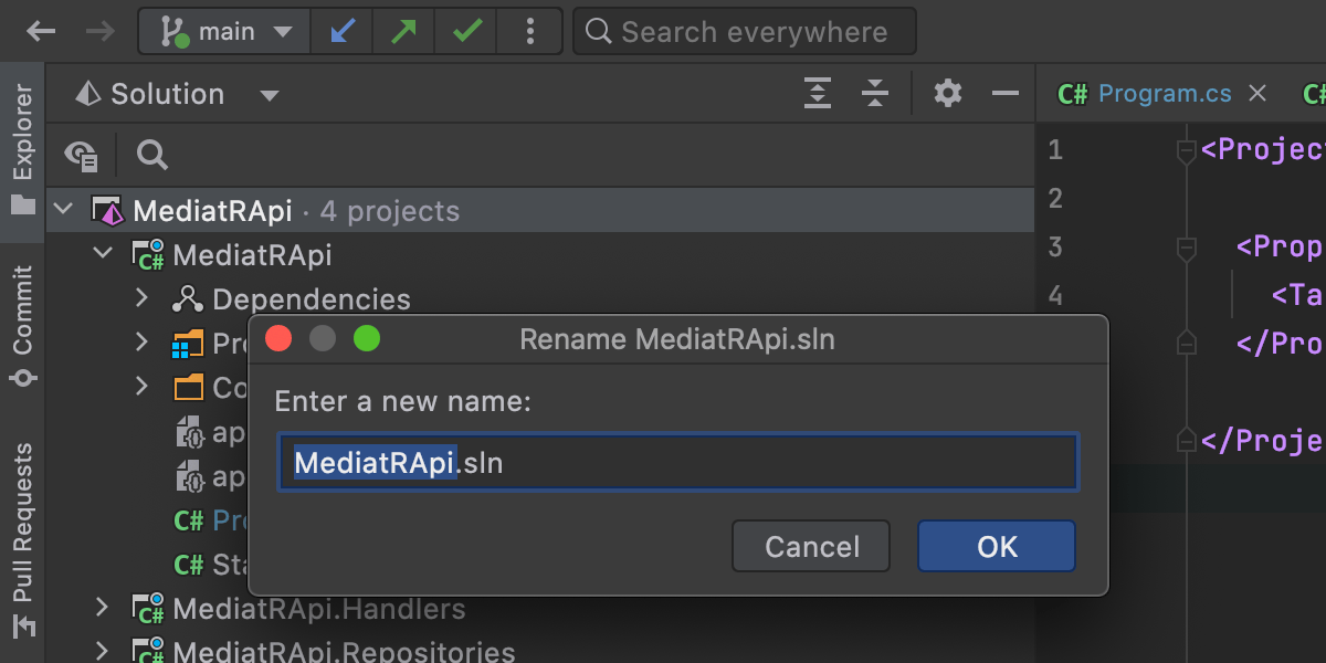命名是一件很难的事。 不过,有时候您可能需要更改整个解决方案的名称。 现在,Rider 可以帮上忙了。 在 Solution Explorer(解决方案浏览器)工具窗口中调用解决方案节点的上下文菜单,选择 Edit | Rename(编辑 | 重命名),然后输入解决方案的新名称。