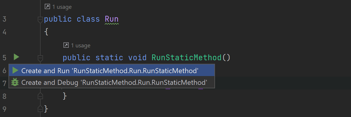 Run Static Method(运行静态方法)操作适用于以 .NET 和 .NET Core 为目标的项目。 您可以点击装订区域边距上的绿色“运行”三角直接从代码编辑器执行任何静态方法。