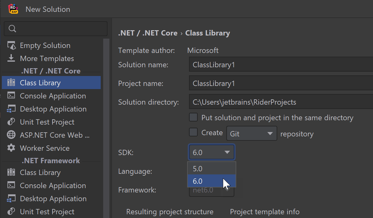 我们已将 SDK 选项添加为 New Solution/Project(新建解决方案/项目)对话框中的下拉列表。 它可以帮助您在安装新版本后为较旧的 .NET SDK 版本创建项目。
