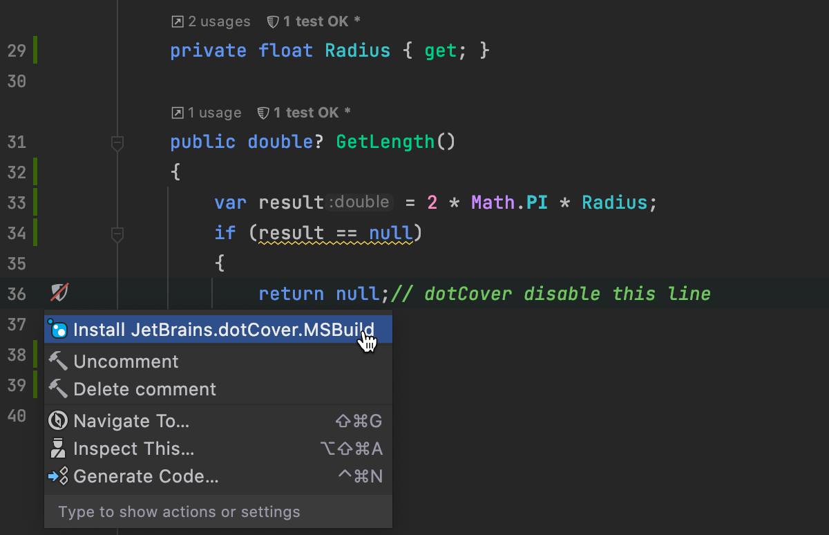 我们实现了将代码标记为 not coverable(不可覆盖)的选项。 您可以使用它从覆盖过程中排除不需要测试的代码并获得更清晰的快照。 要使用此功能,请安装 JetBrains.dotCover.MSBuild NuGet 软件包并在代码周围添加注释 // dotcover disable/enable。 有关详情,请参阅此工单。