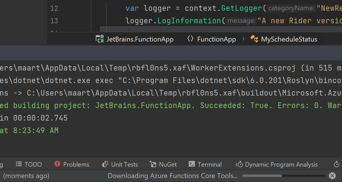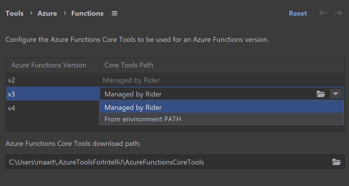 Rider 默认为您管理 Azure Functions Core Tools。 它会根据项目下载所需工具,并自动使其保持最新状态。