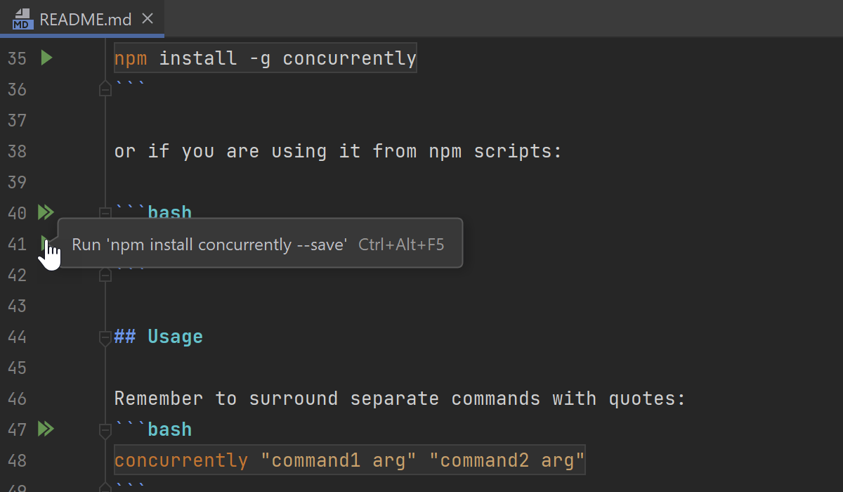 如果 Markdown 文件包含您需要在终端中执行的命令的指令,您可以使用装订区域中的运行图标直接从 Markdown 文件运行这些命令。