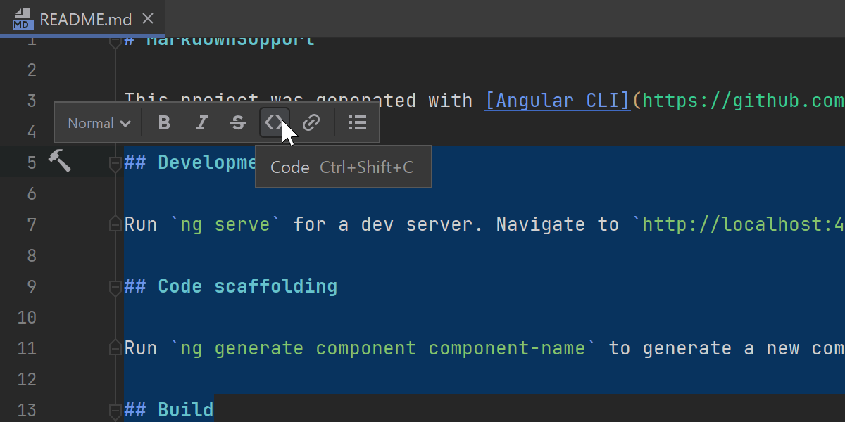 我们在编辑 Markdown 文件时将出现在文本选区上的浮动工具栏中添加了新选项。 使用此工具栏可以快速选择标题样式并创建列表。 您可以使用所需选项自定义此工具栏。 为此,请转到 Preferences / Settings | Appearance & Behavior | Menus and Toolbars | Markdown Editor Floating Toolbar(偏好设置/设置 | 外观与行为 | 菜单与工具栏 | Markdown 编辑器浮动工具栏)。