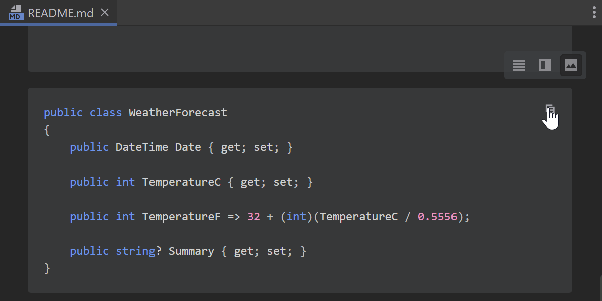 我们还向 Markdown 块添加了 Copy code snippet(复制代码段)操作,让您可以轻松地将内容复制到剪贴板。