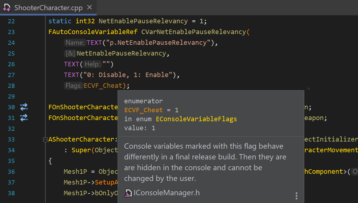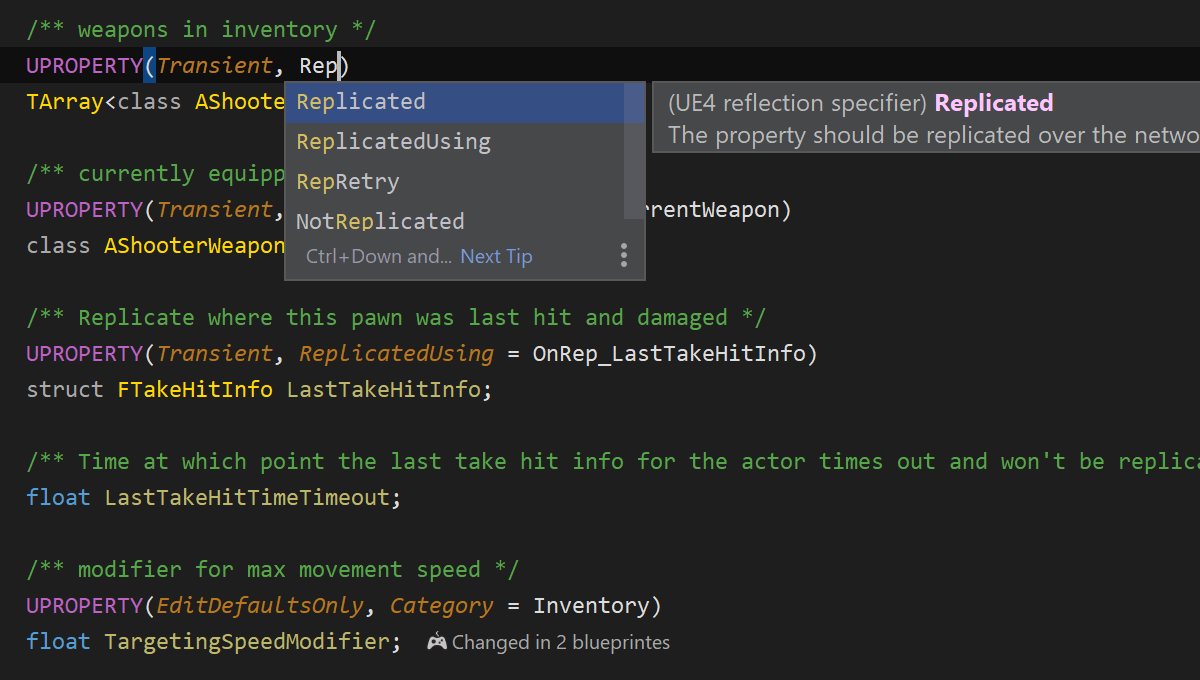 Unreal Engine 反射宏和反射说明符不仅仅是 Rider 的纯文本替换。 自动补全和快速文档了解这些实体并有助于高效编码。 同样,Unreal Engine 远程过程调用不仅仅是常规函数,Rider 会在代码导航和代码生成期间将其匹配。