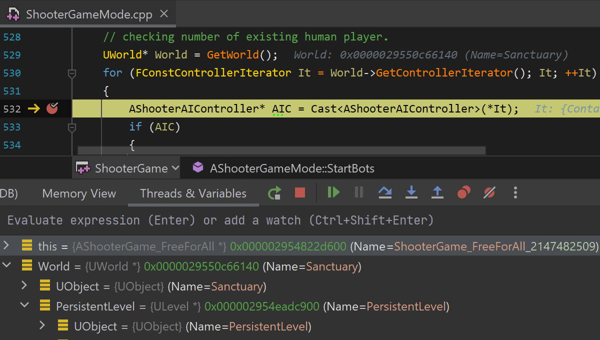 基于 LLDB 的 调试器,支持 Unreal Engine Natvis,帮助您发现游戏代码或引擎中的任何问题。 您可以设置行、符号、数据和条件断点。 您还可以在调试会话期间直接在 Rider 编辑器中逐步执行代码、计算表达式以及查看变量值。