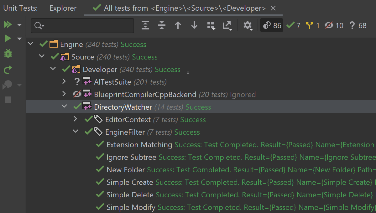 Rider 为 Unreal Engine Automation Testing 框架提供了开箱即用的支持。 从 Unit Test(单元测试)工具窗口或直接从编辑器启动测试,查看其结果,然后重新运行失败、全部或特定测试。