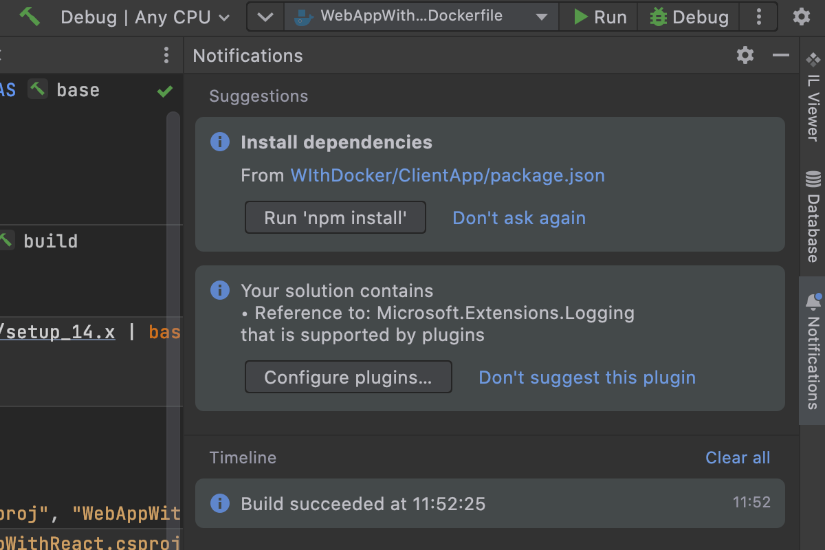 在容器中构建项目可能比在本地机器上构建慢得多。 启用 Fast 模式后,Rider 将首先使用 docker build 创建 Docker 镜像的基础暂存,然后在主机上构建项目,显著提升速度。 最后,项目工件作为卷挂载到 Docker 容器。 此模式仅适用于 Debug(调试)配置,在 Release(发布)下构建的项目将按照 Dockerfile 中的步骤构建。