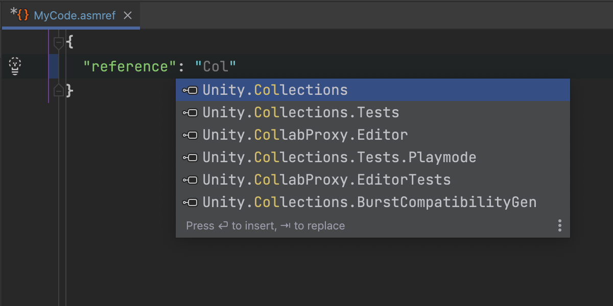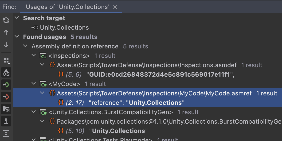Rider 现在支持 .asmref 程序集定义引用文件以及 .asmdef 文件。 您将获得语法高亮显示、架构验证和补全。 在引用名称上按 Ctrl 并点击将导航到引用的 .asmdef 文件,.asmdef 文件将在 Find Usages(查找用法)中显示。