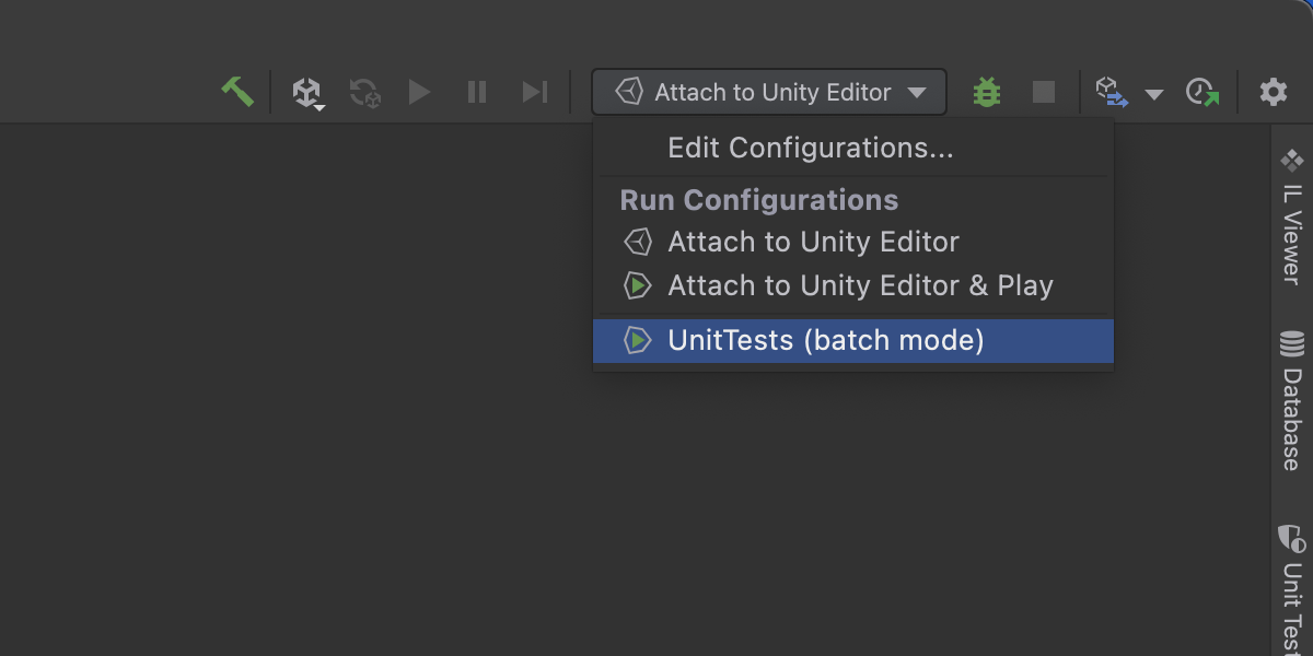 每个项目有一个新的默认运行配置,用于在批量模式下运行 Unity 编辑器,这非常适合运行单元测试并将结果保存在 Logs 文件夹中。
