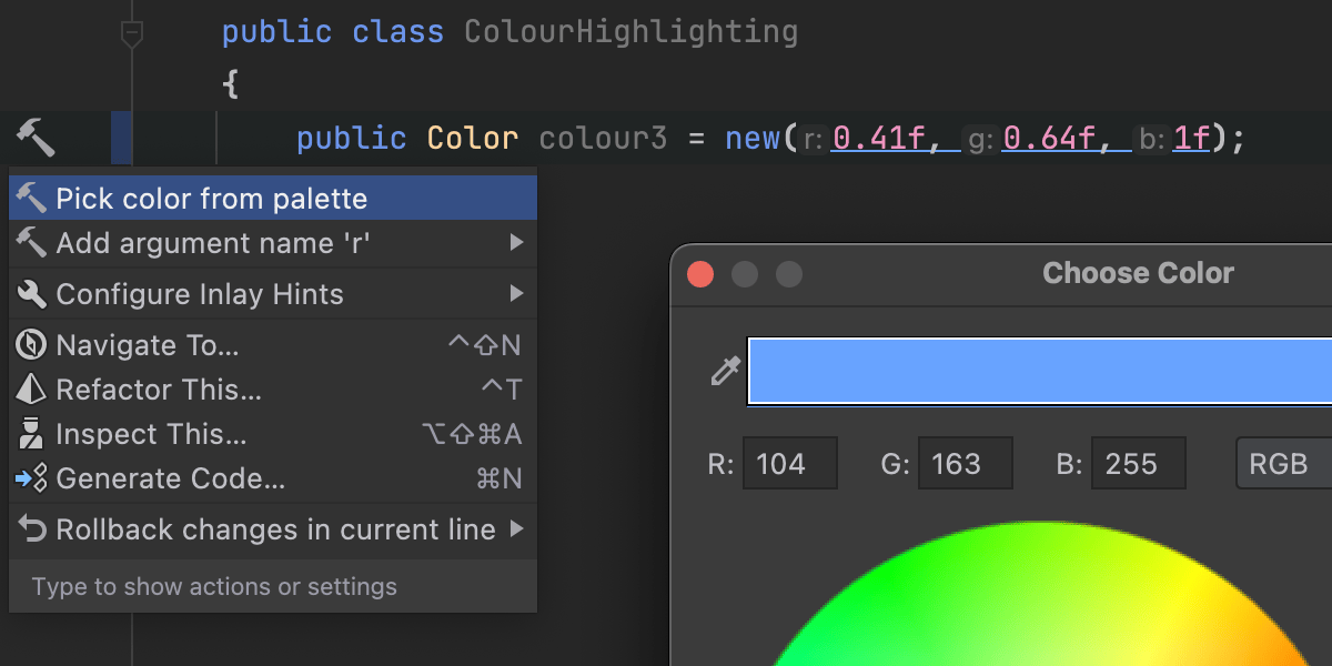在 Unity 支持较新版本的 C# 后,Rider 得以扩展 Unity Color 类型的高亮显示,包含目标类型的 new 表达式。 快速预览您已声明的颜色,并使用 Alt+Enter 选择新值。