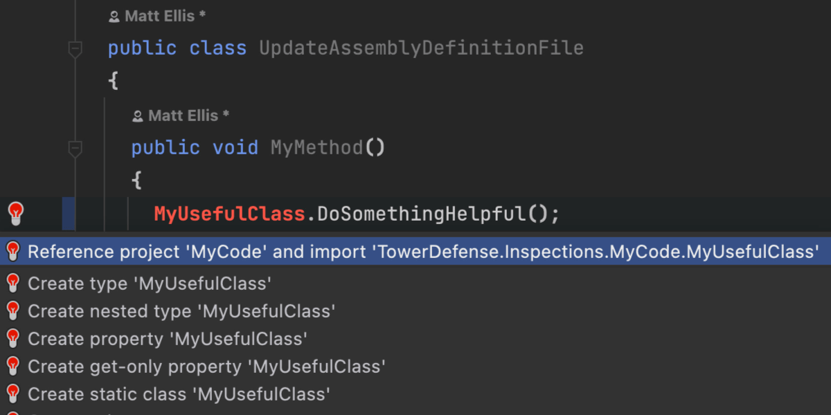 现在,每当您添加或移除对项目的引用时,Rider 都会自动更新您的 .asmdef 文件。 如果使用了来自另一个项目的类型,Rider 将添加对 .asmdef 文件的引用并导入该类型。