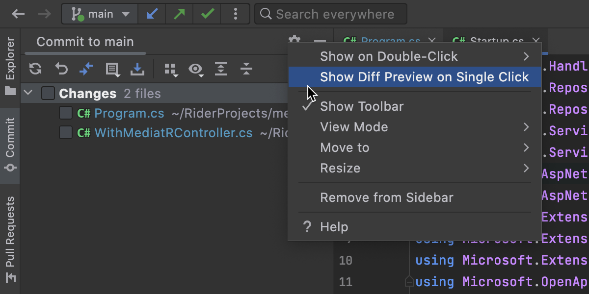我们将 Preview Diff(预览差异)图标从 Commit(提交)工具栏移至齿轮图标,并将其重命名为 Show Diff Preview on Single Click(点击时显示预览差异)。 您可以在这里指定点击 Changes(更改)树中的文件时希望看到的行为:只需选择文件或打开差异预览。