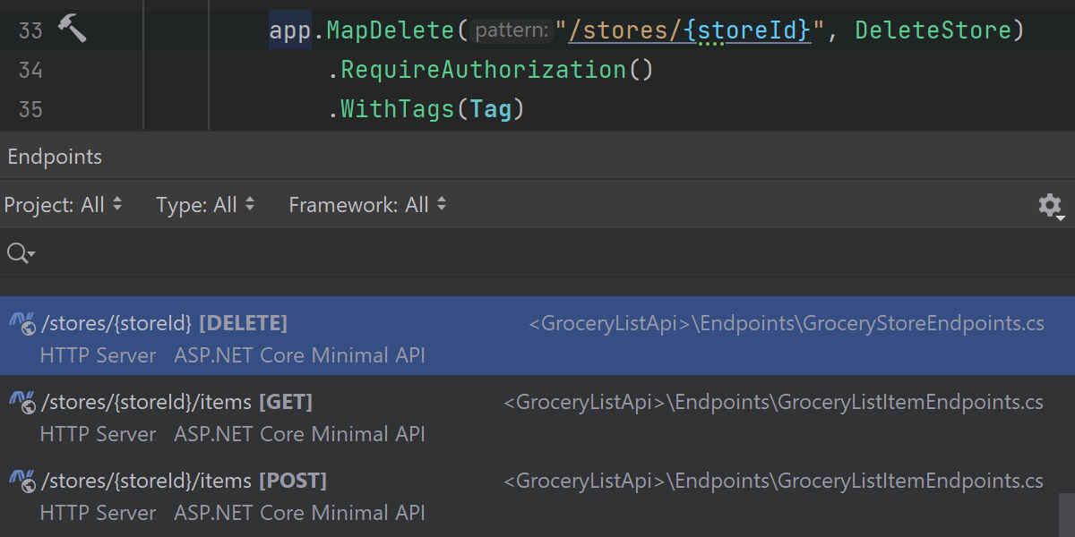 我们将继续改进我们的 Endpoints(端点)支持和 Endpoints Viewer(端点查看器)。 查看器现在还会感知和收集 ASP.NET Core 6 最小 API 路由和基于约定的路由的端点。 这意味着除了已经可用的功能之外,您还可以探索和导航到这些端点并使用智能代码补全。