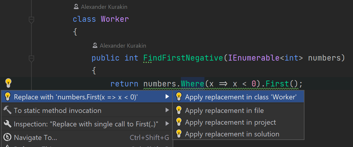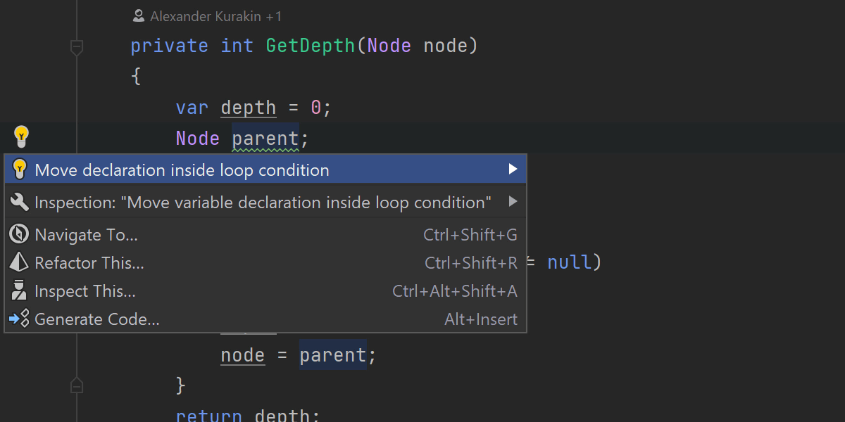 为了使重构更加醒目,我们研究了最常用的重构,并在 Alt+Enter 菜单中引入了依赖于当前上下文的相关上下文操作。