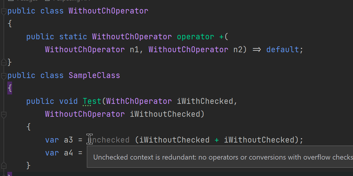 更新的 Unchecked/checked context is redundant(unchecked/checked 上下文冗余)检查能够在此上下文中使用 checked 运算符时将其纳入考量。