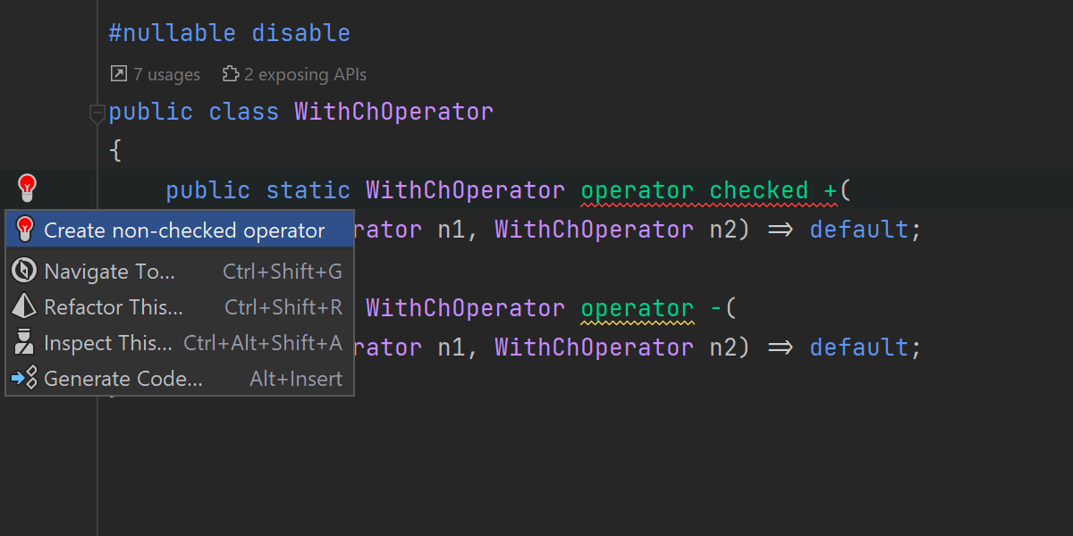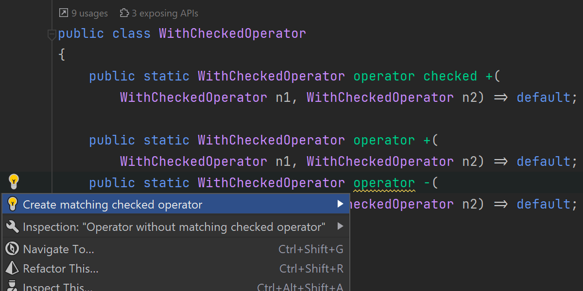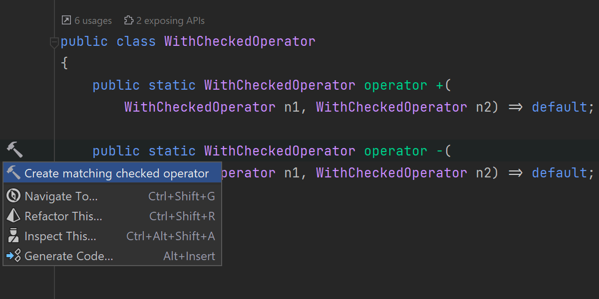 如果您还没有在代码库中使用 checked 运算符但想开始添加,可以使用新上下文操作 Create matching checked operator(创建匹配 checked 运算符)。 它适用于每个用户自定义运算符,可在 Alt+Enter 菜单中一键生成运算符的 checked 版本。
