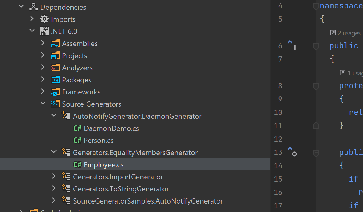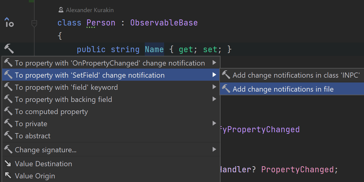 INotifyPropertyChanged 支持的更新 在此版本中,我们重做了 INotifyPropertyChanged 支持。 它不再依赖于外部注解来检测常见 INotifyPropertyChanged API,我们由此能够自动支持更多的 MVVM 框架和 INotifyPropertyChanged 基类。 我们现在可以发出 SetField 方法,该方法能够为 INotifyPropertyChanged 通知实现最简洁的语法。