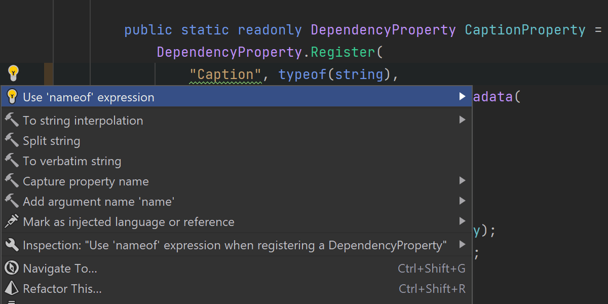 Rider 2022.2 现在可以识别 WPF 项目中 DependencyProperty 的注册,并建议使用 nameof 运算符来捕获相应的 CLR 属性名称。 更新的内置实时模板将发出 nameof 而不是字符串字面量。